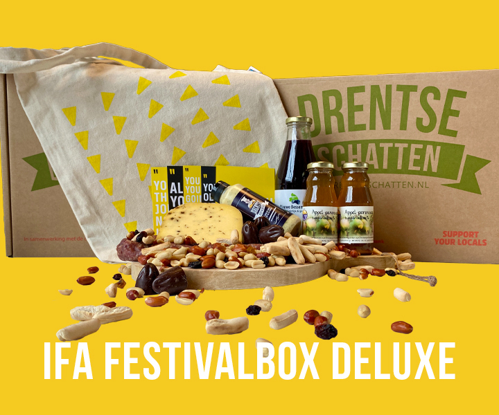 Beide boxen bevatten het lokaal gebrouwen bier Dubbel Drents en een fles wijn voor de wijnliefhebber. Naast drank bevat de de IFA Borrelbox ook Drentse kruidenkaas, een droge worst en een boerenmix van verse noten. Tot slot vind je er ook een set toffe IFA-ansichtkaarten! Ga jij liever voor de IFA Festivalbox Deluxe? Dan ontvang je naast meer lokaal bier ook nog een IFA-schoudertas, Drentse dipstokjes en Bonbons van Vanderveen Assen.