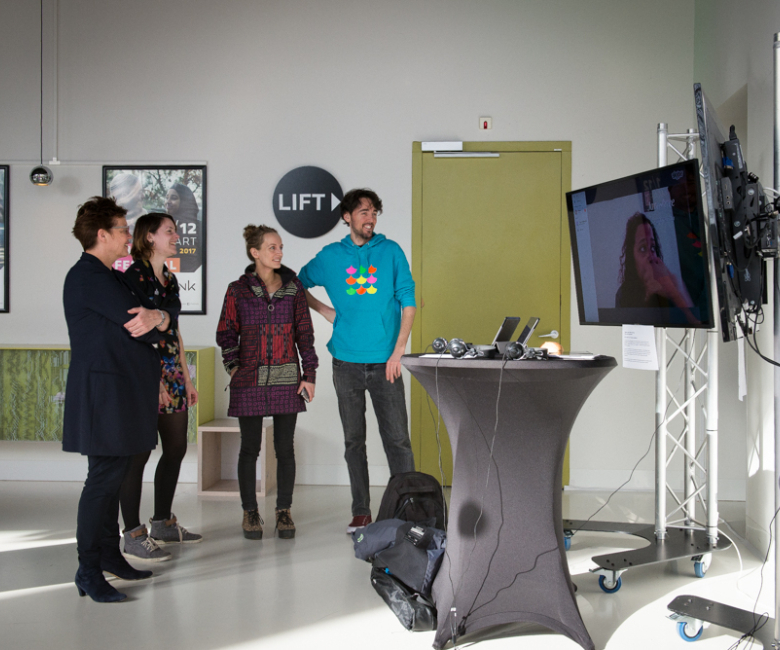 ‘Door IFA was er destijds een prijsvraag uitgeschreven met de vraag hoe je het festivalpubliek het gevoel kon geven in contact te staan met de hele wereld. Ik besloot een installatie te maken waarbij je in contact kon komen met vrouwelijke filmmakers over de hele wereld – vrouwen die je buurvrouw zouden kunnen zijn, met als enige verschil dat ze aan de andere kant van de wereld wonen. De vrouwen praatten in korte filmpjes over hun ervaringen als filmmaker in hun thuisland. Het publiek kon deze makers berichten sturen via de schermen die in DNK stonden. Vanwege het tijdsverschil en beperkte toegang tot internet kwamen de reacties van het publiek niet direct live bij de makers terecht, maar kregen zij een dag later antwoord op hun vragen.’