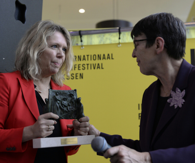 ‘Ik wil om te beginnen het festival bedanken en feliciteren met deze prachtige selectie van films. Het is ongelooflijk wat jullie hier neerzetten. Vrouwenemancipatie is vandaag de dag nog zo belangrijk. Hollywood kan nog veel van jullie leren’, aldus Sandra den Hamer bij het in ontvangst nemen van de prijs.